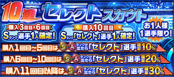 ・Sランク選手・Aランク選手が出た場合、30%の確率で「セレクト」選手が登場!さらにスカウトの購入回数に応じて、以下の特典つき!
