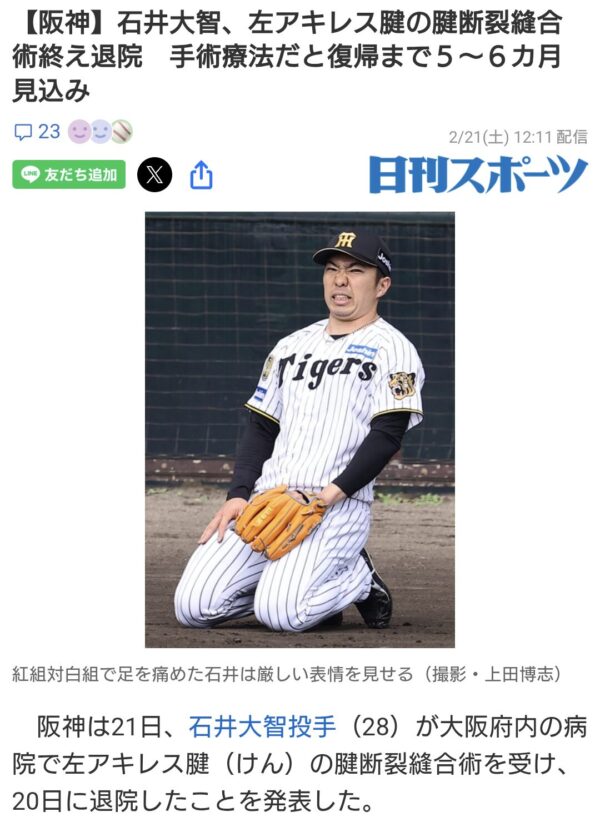 石井アキレス腱断裂…ゲーム的に伊藤智仁みたいな扱いになるのかな